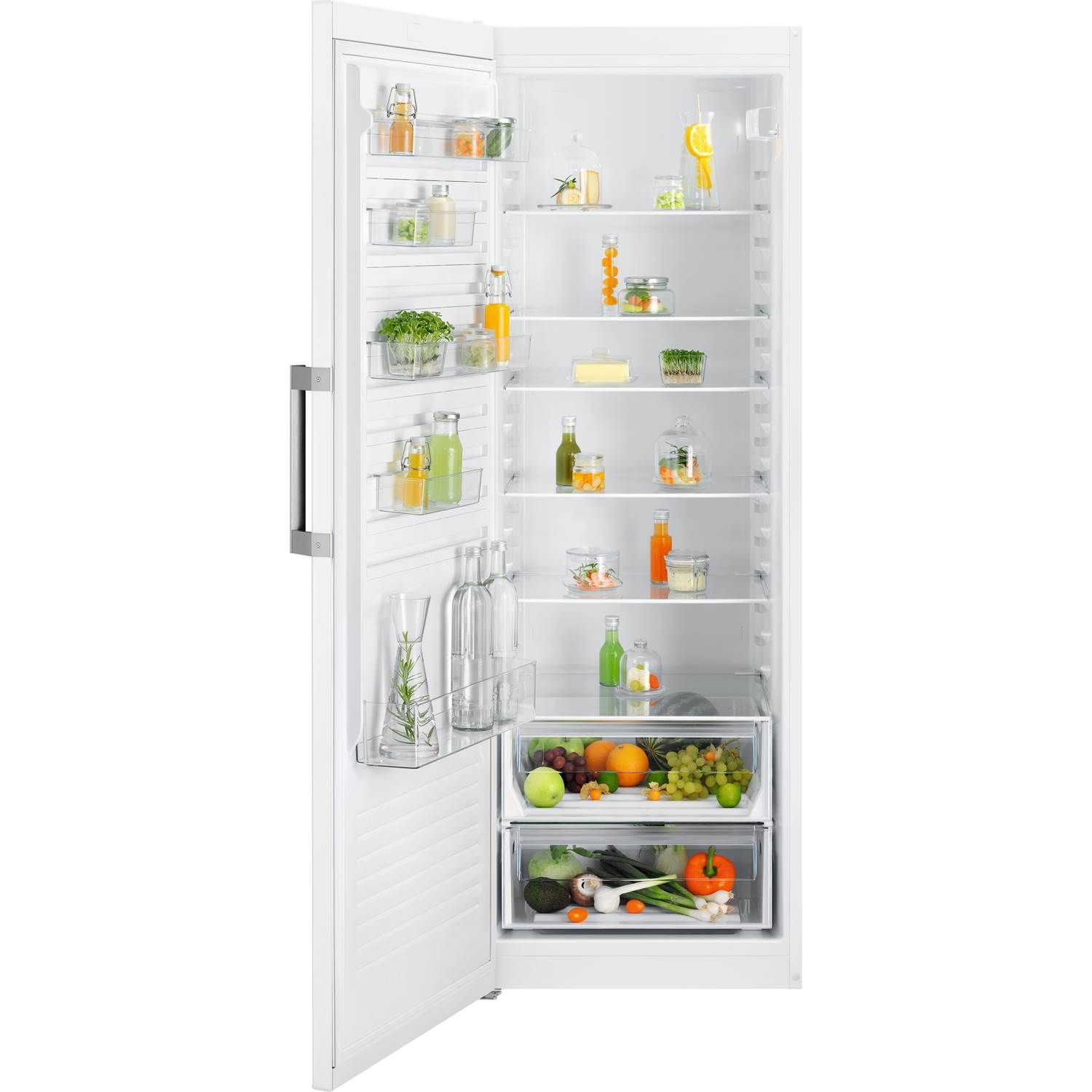 Electrolux XRE7DX1 er et fritstående køleskab i 700-serien, der holder en stabil temperatur i hele kabinettet. MultiFlow-cirkulationen fordeler den kolde luft jævnt, så frugt, grønt og mejerivarer bevarer sprødhed, tekstur og smag længere – også når døren åbnes ofte i en travl hverdag.