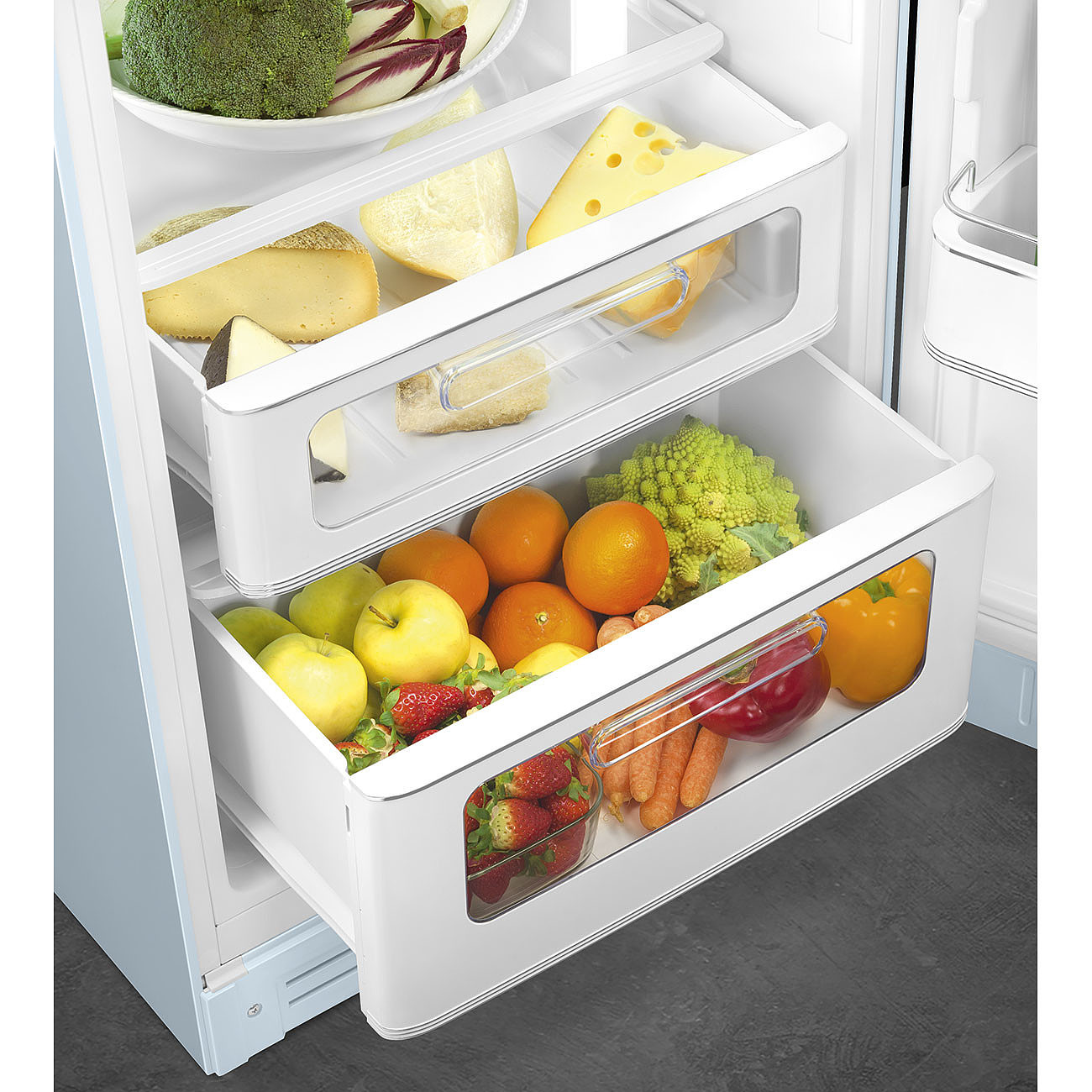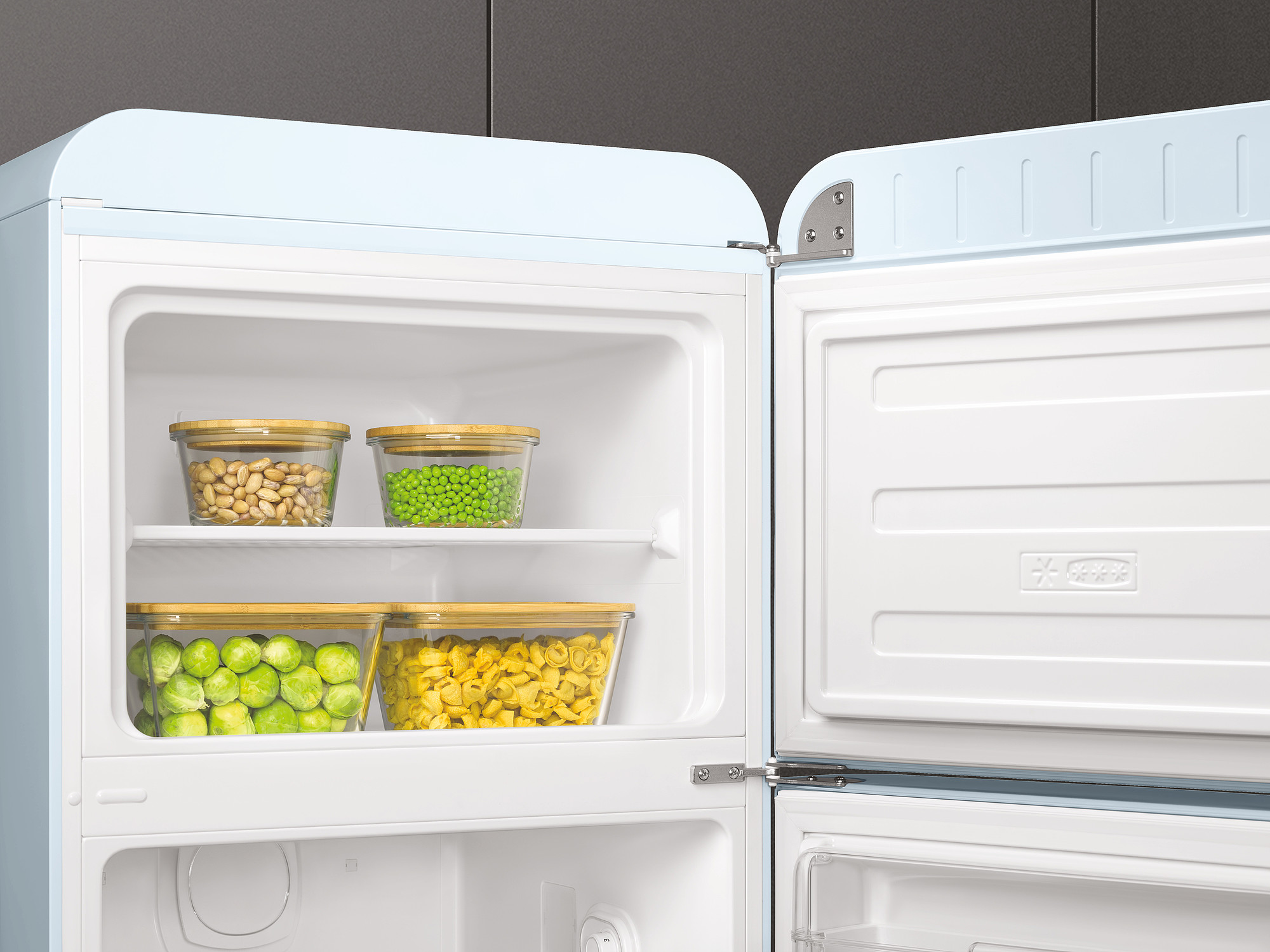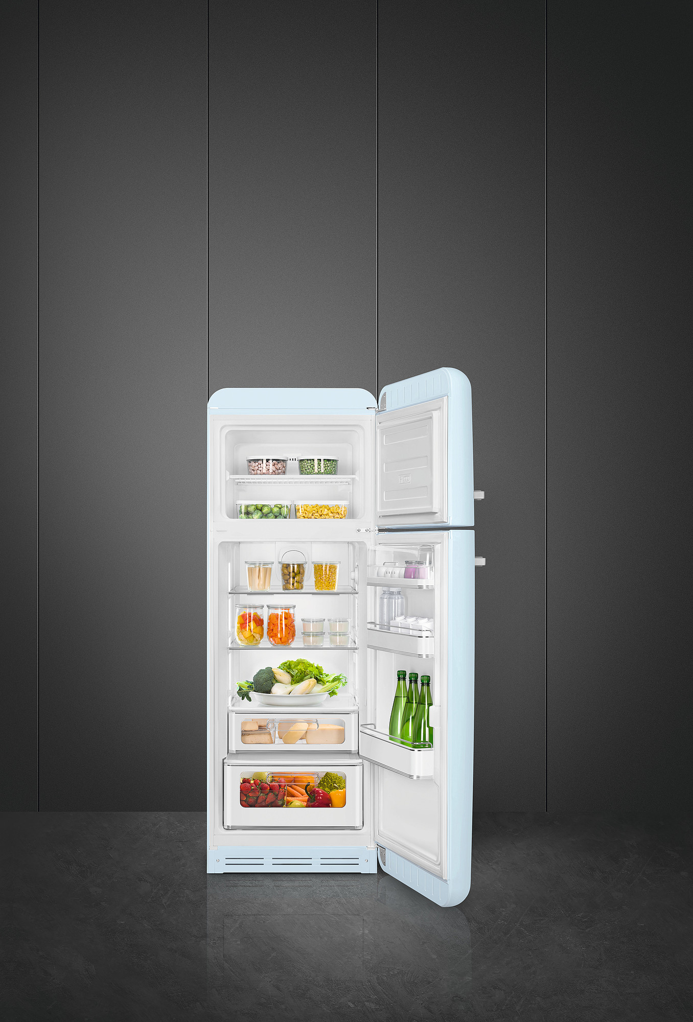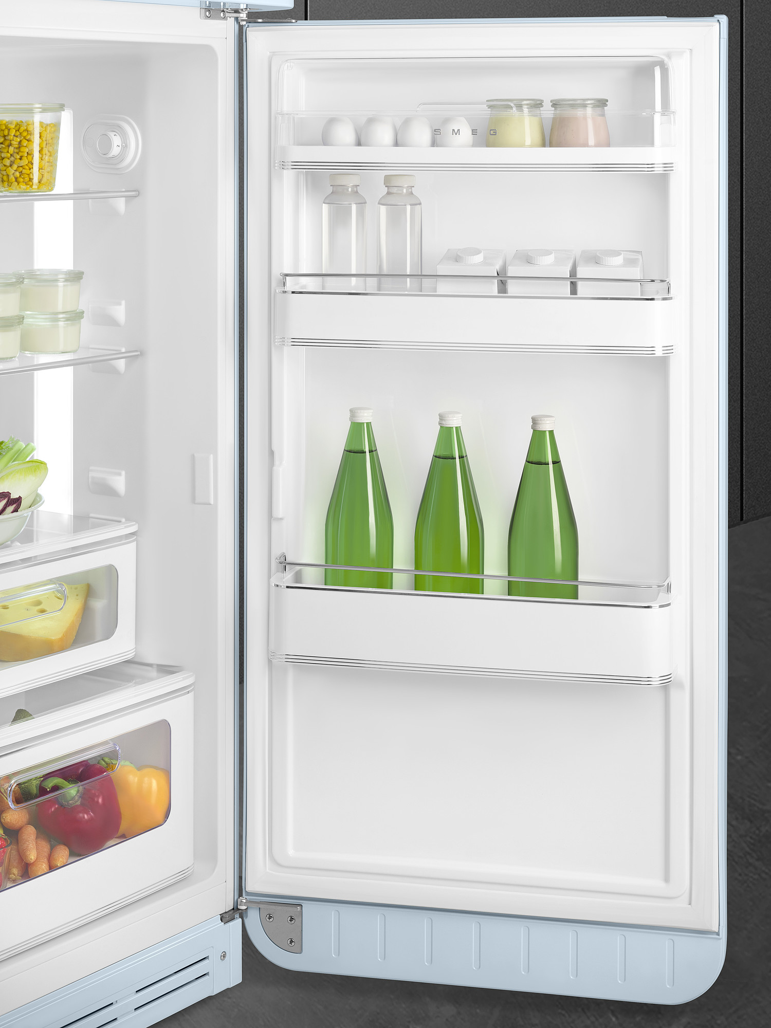 Køleskab fra Smeg i pastelblå med separat fryserum, grøntsagsskuffe og LED belysning. Læs hele beskrivelsen